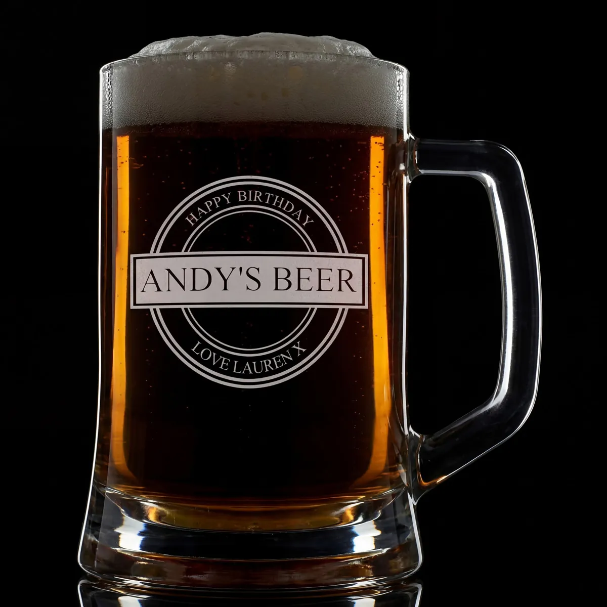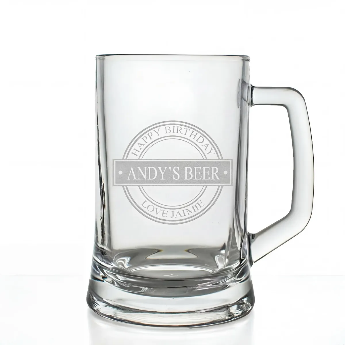 This personalised tankard is engraved with our unique birthday badge design. The glass can be engraved with any name along the centre of the badge and a message on an arc above and below the name.