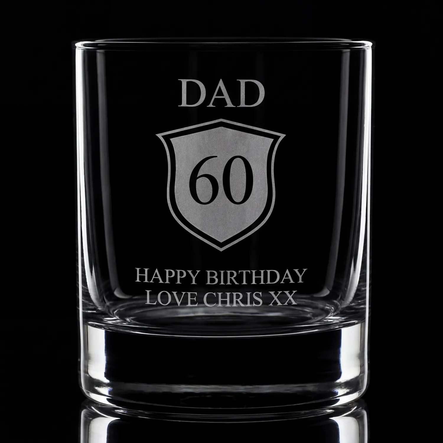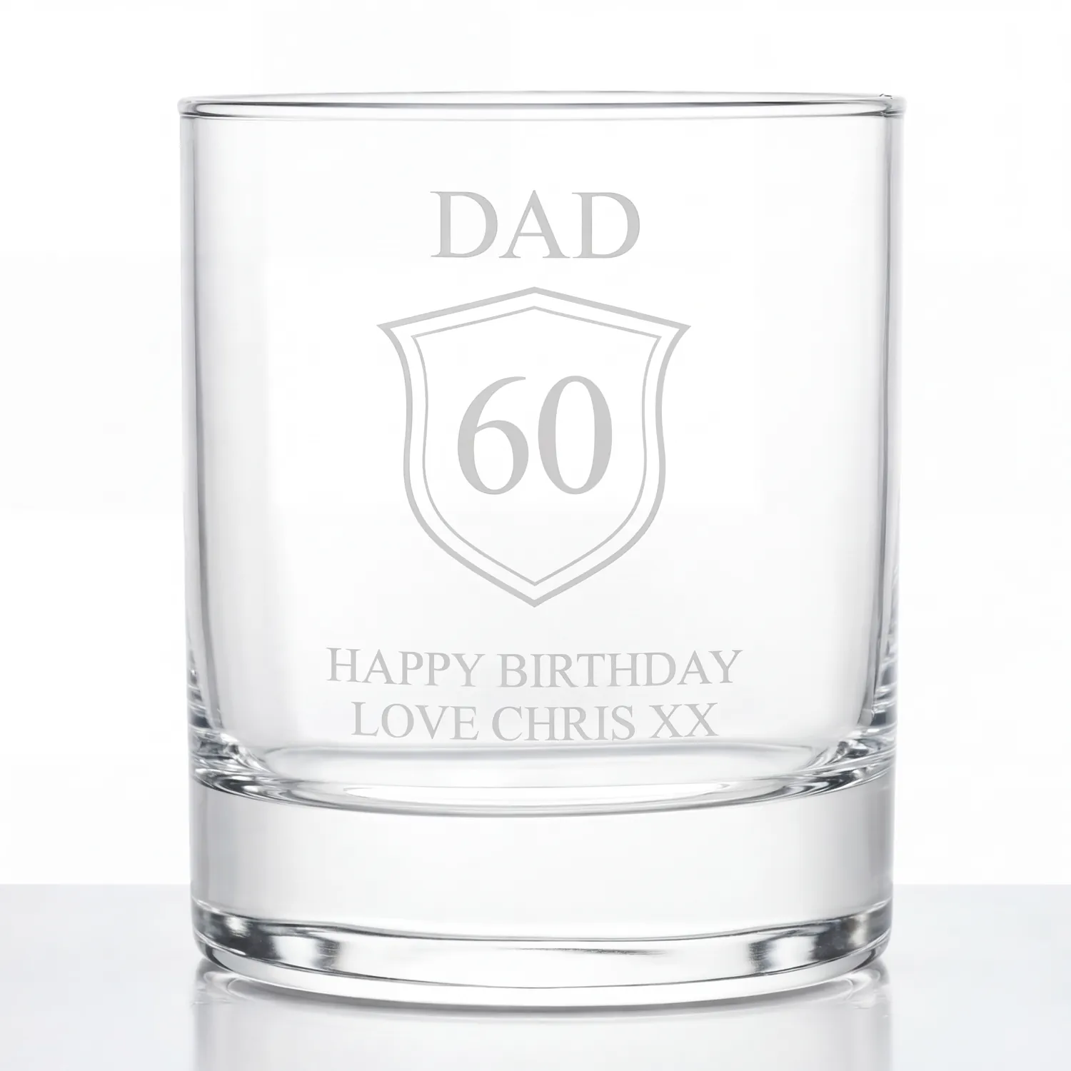 This engraved birthday whisky glass is etched with our shield design and any personalisation of your choice.