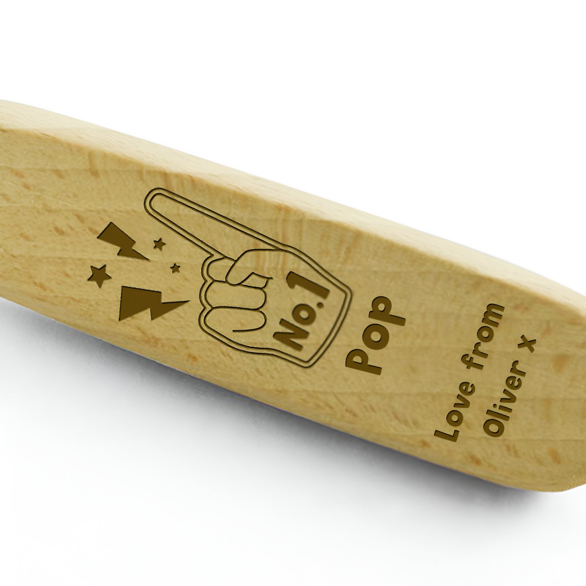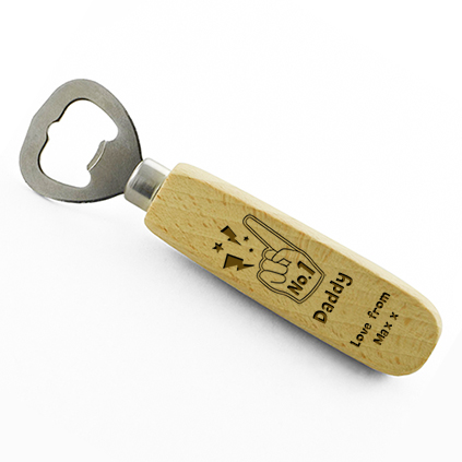 Our custom beech wood bottle opener comes professionally engraved with our exclusive 'foam hand' illustration with the words 'No1' on it and space below to personalise with any text you like meaning you can adapt to suit your recipient. There is also 3 lines of text for you to write a short message.