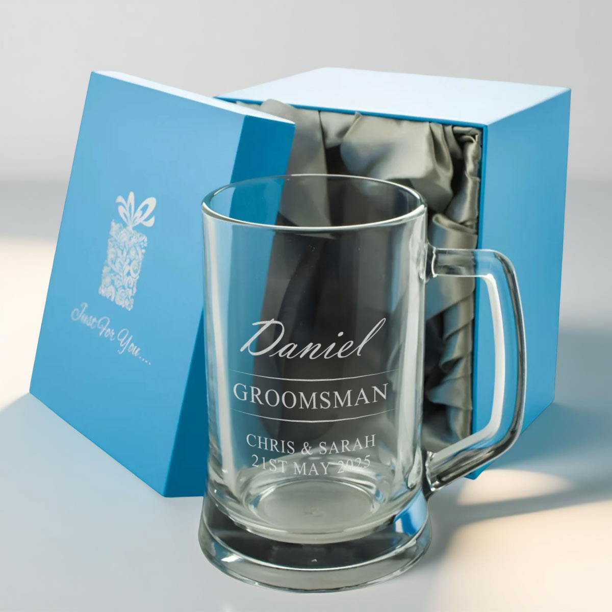 Say thank you to the best man and all of the groomsmen with their very own personalised wedding pint tankard. You can fully customise this glass with any name, wedding role and message engraved to create a wonderful gift for everyone involved.