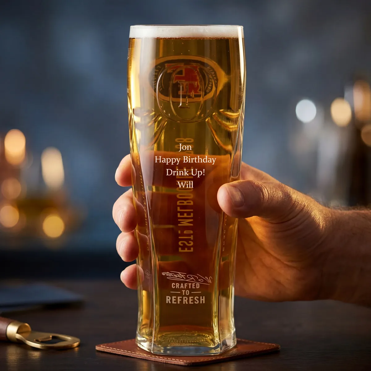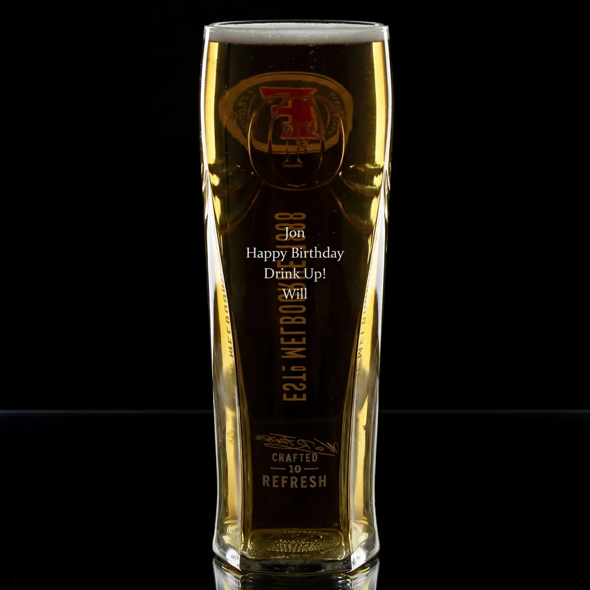 This engraved Fosters glass can be personalised with any message on the back of the glass.