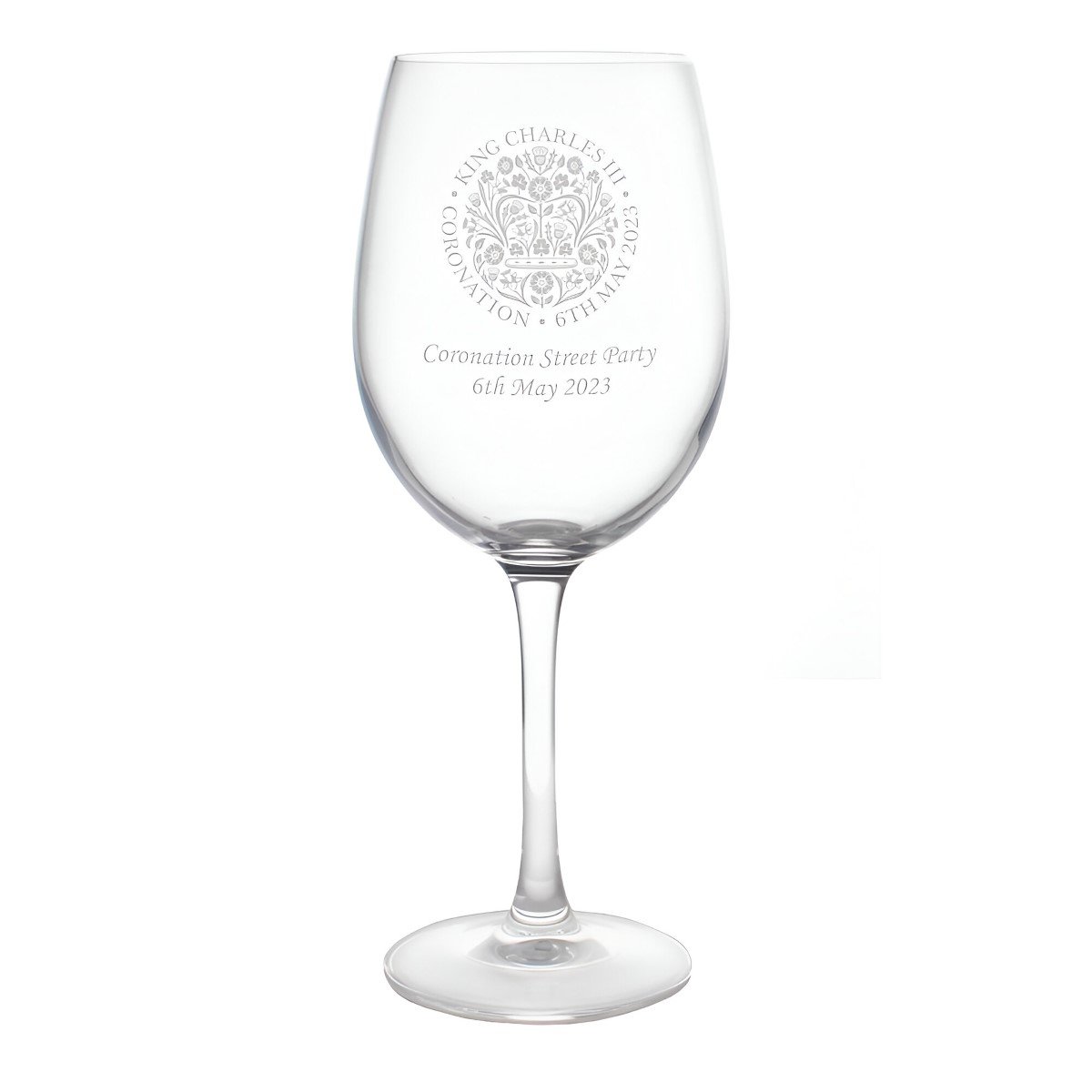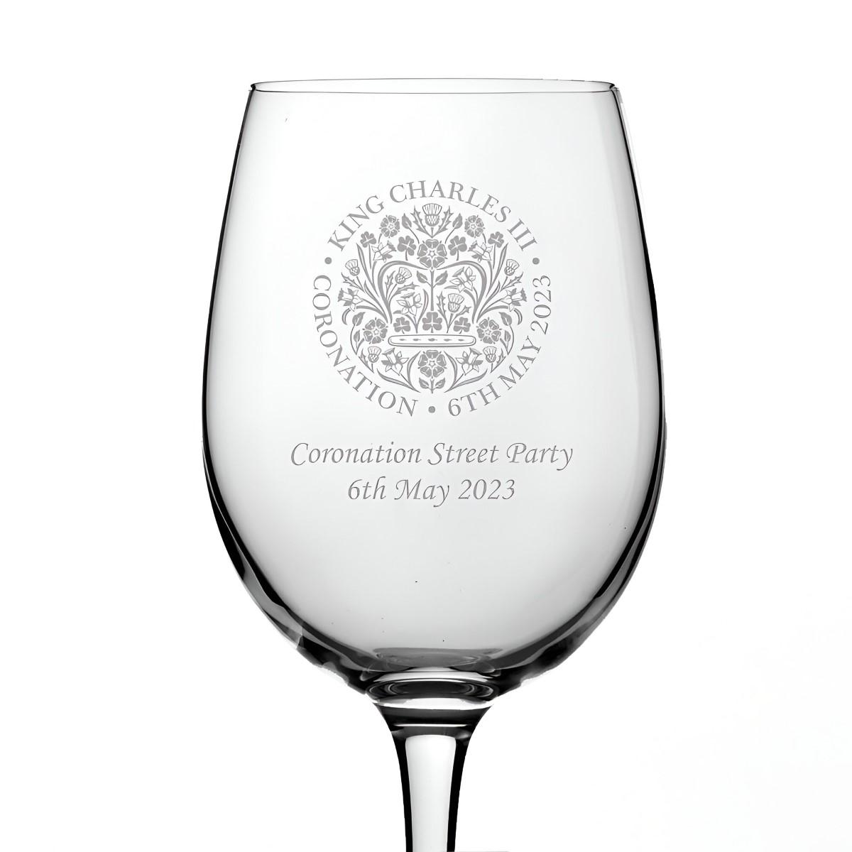 Get this personalised Coronation wine glass to enjoy King Charles III Coronation celebrations. This glass is engraved with the official coronation emblem and can also be personalised with any message of your choice.