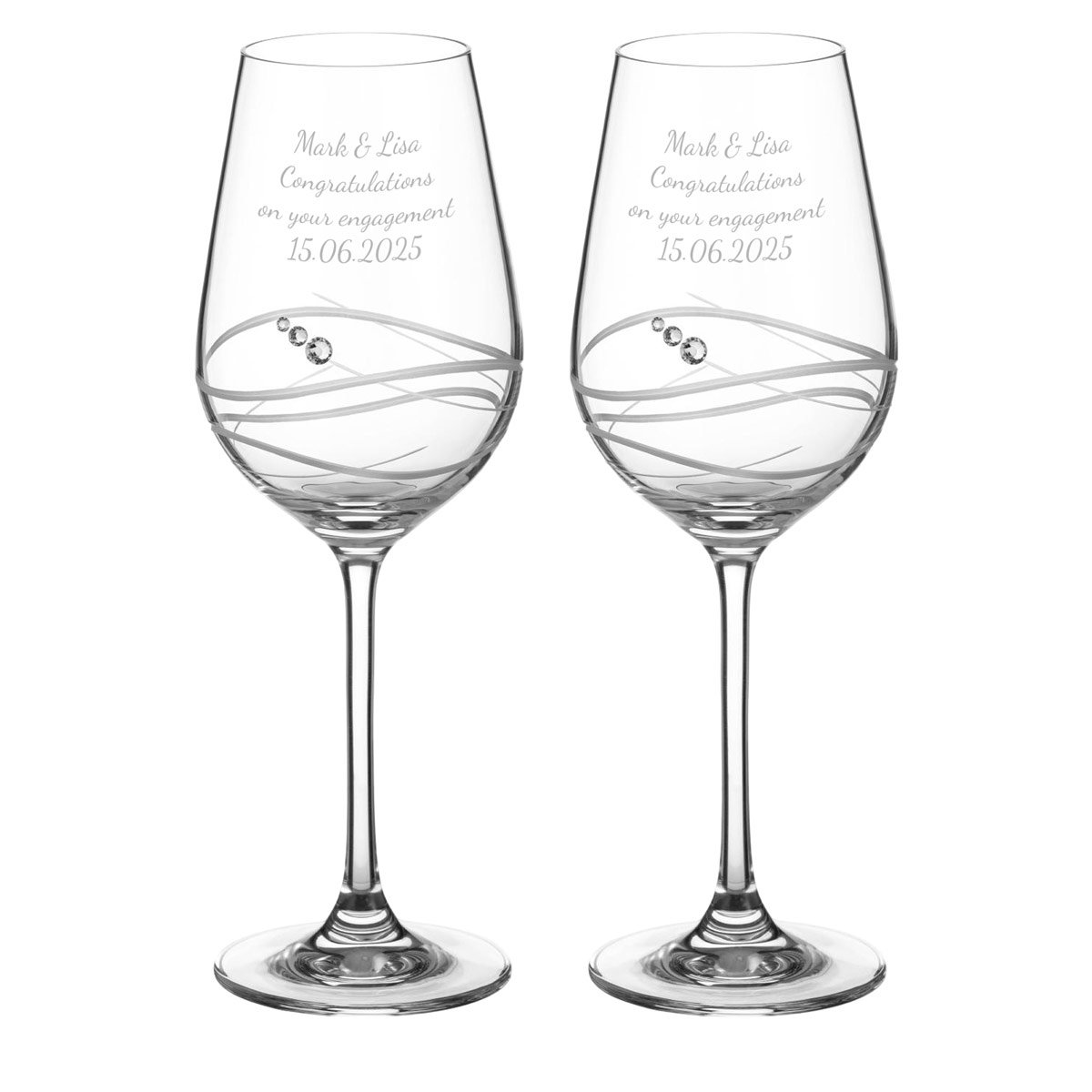 These two wine glasses are crafted to the highest quality and are part of the Diamante Exixir collection. They are perfect for any special occasion with any message of your choice laser-engraved on both glasses.