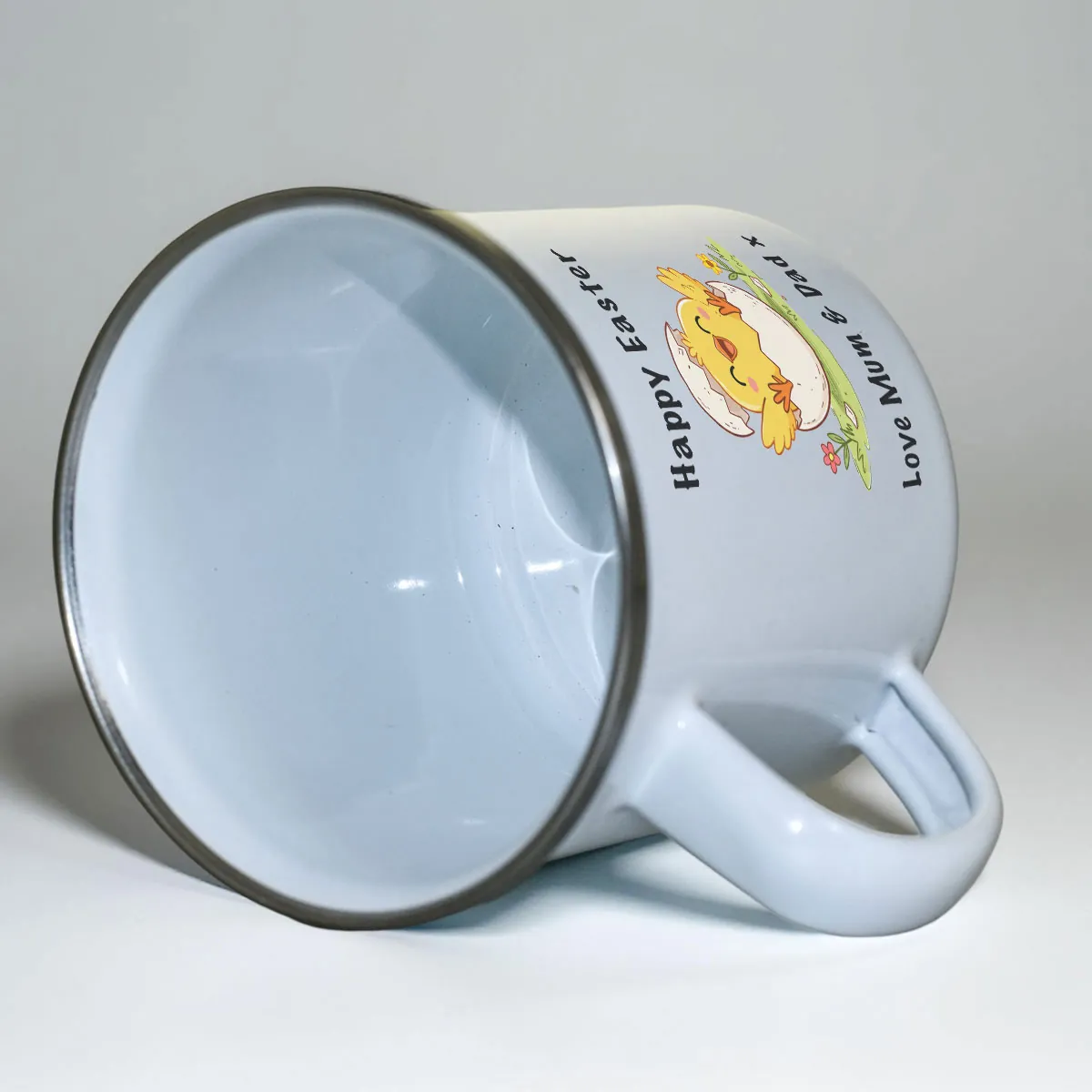 Made from durable white enamel with a classic silver rim, this charming mug is designed to last and is ideal for both indoor use and outdoor adventures. It features an adorable chick hatching from an egg, surrounded by sweet springtime details that capture the joy of Easter.