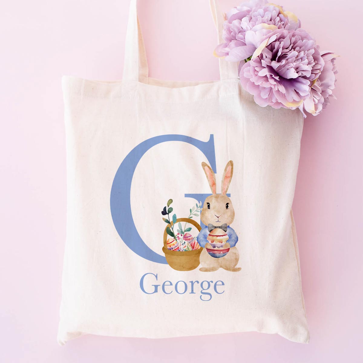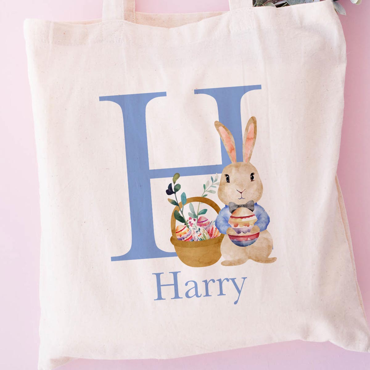 Featuring a charming, hand-designed blue Easter bunny wearing a bow tie and carrying a basket of colourful Easter eggs, this tote is as cute as it is practical.