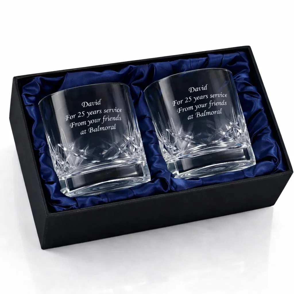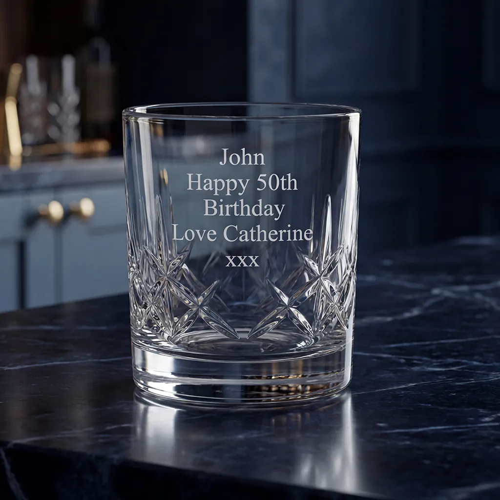 Each glass features a dedicated smooth panel amidst the crystal cutting, specifically designed for engraving. Whether it’s a 60th Birthday, a Retirement, or a Wedding Anniversary, your personal message will be precision-etched forever.