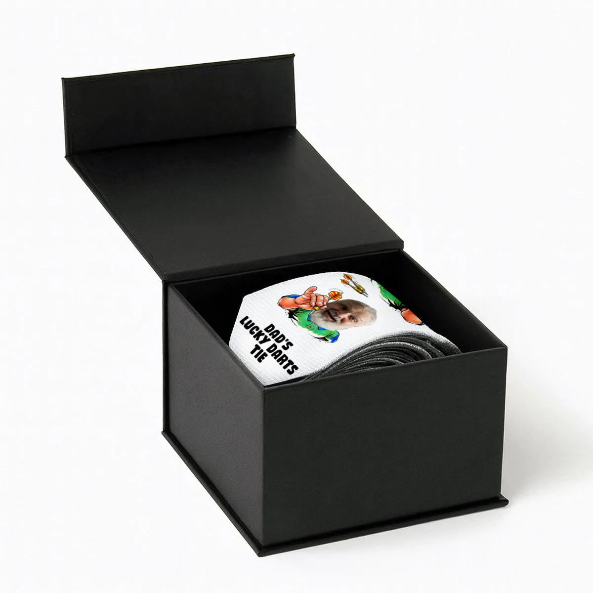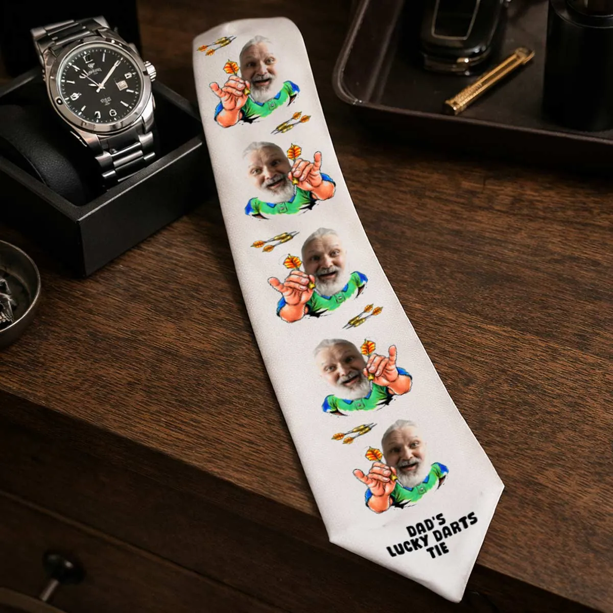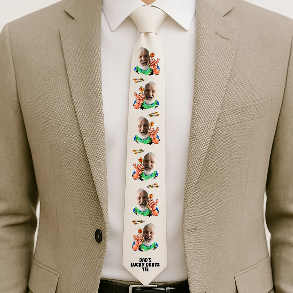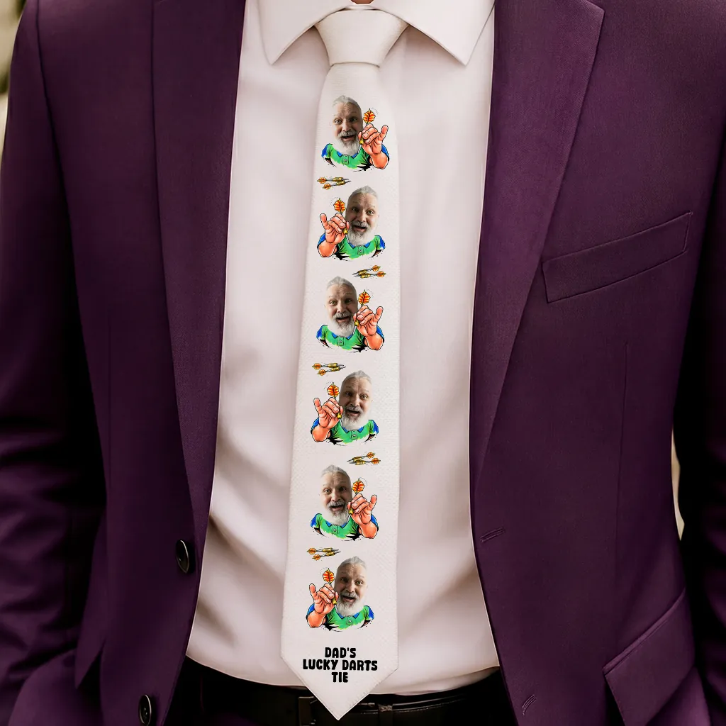 The Dad’s Lucky Darts Tie lets you turn his face (or yours!) into a standout design he’ll never forget. Featuring a playful dartboard-inspired theme with illustrated elements and repeated face cutouts, this tie brings personality to any outfit - whether he’s heading to work, a party, or just showing off his legendary dad humour.