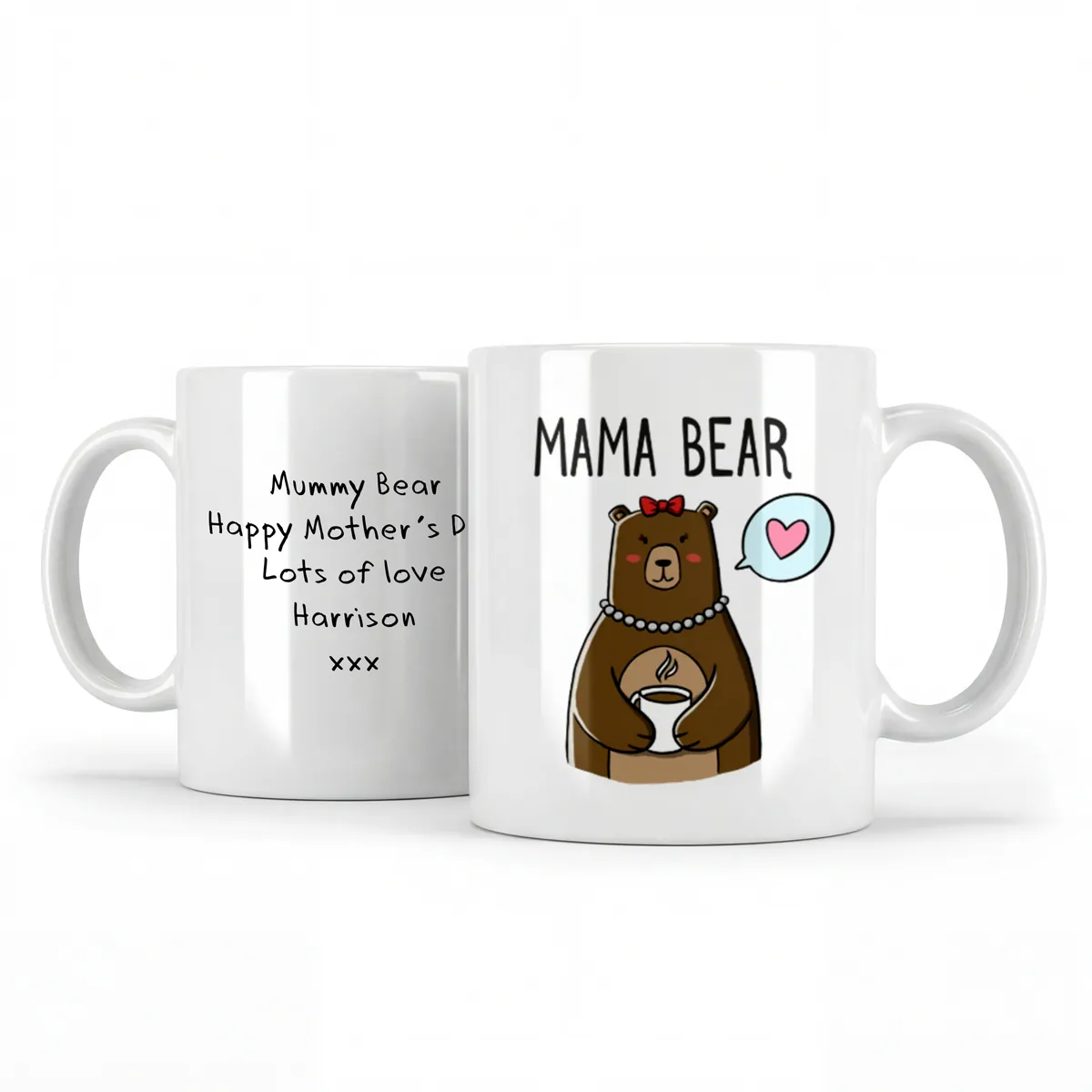 If you're looking for a gift for a magnificent Mama Bear who loves her little cubs then look no further! This beautiful design features a loving bear holding a hot cup of her favourite beverage and the words 'Mama Bear' printed in black. You can personalise this mug by entering a special message of your choice across 6 lines of text. This is the perfect gift for Mother's Day, birthday's or simply just because!