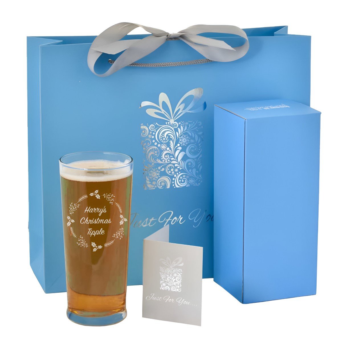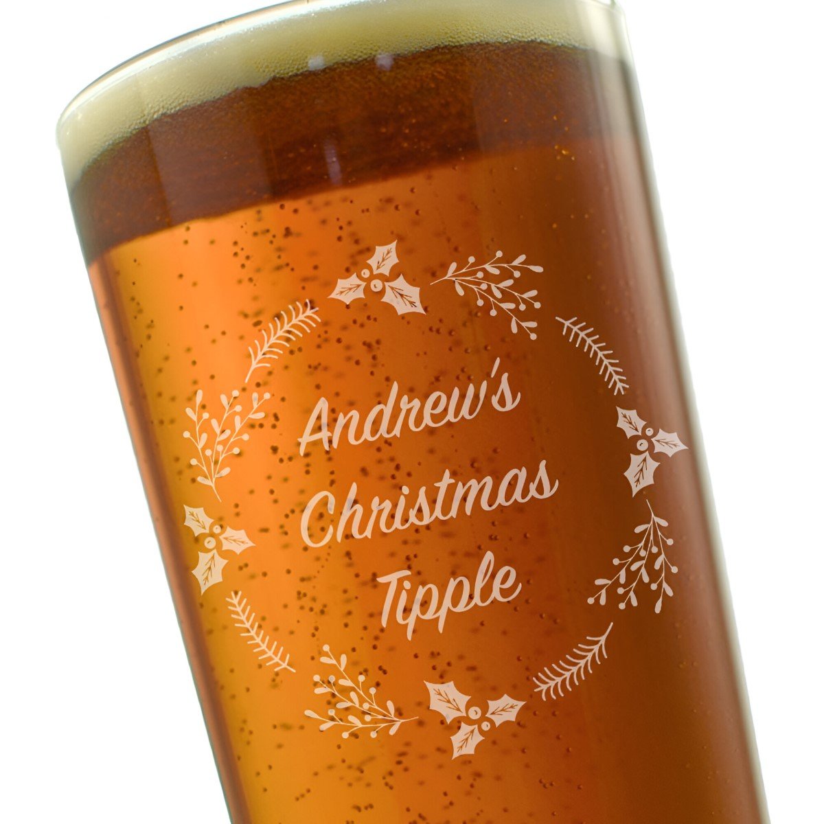 Our pint glass features a seasonal Christmas wreath design and can be personalised with any Name and message which is then professionally engraved.
