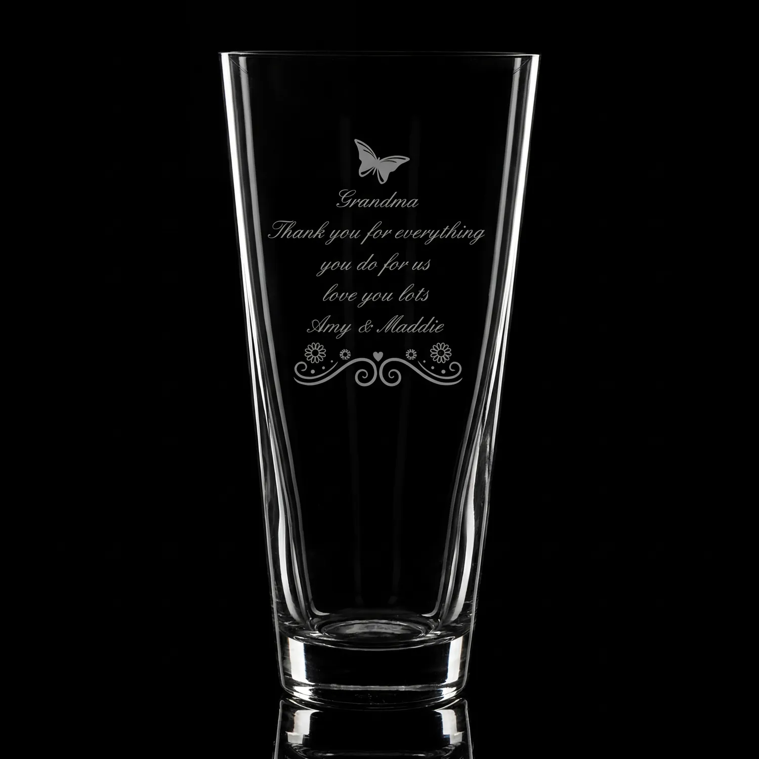 - This vase is engraved with our lovely butterfly and flower filigree and can also be accompanied by a personalised message of your choice.