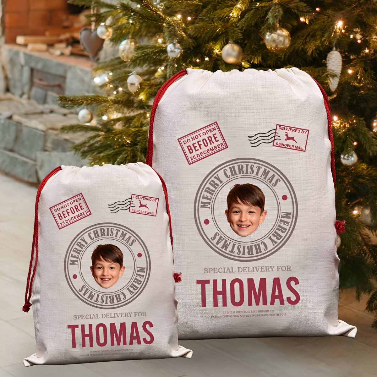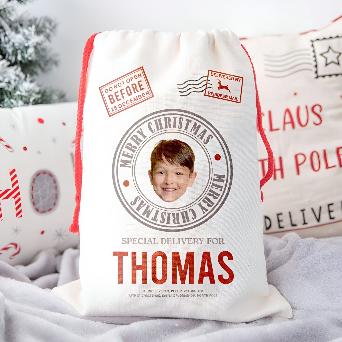 Have your kid's face cut out and printed in the middle of their very own Personalised Christmas Santa Sack!