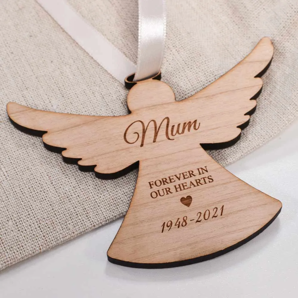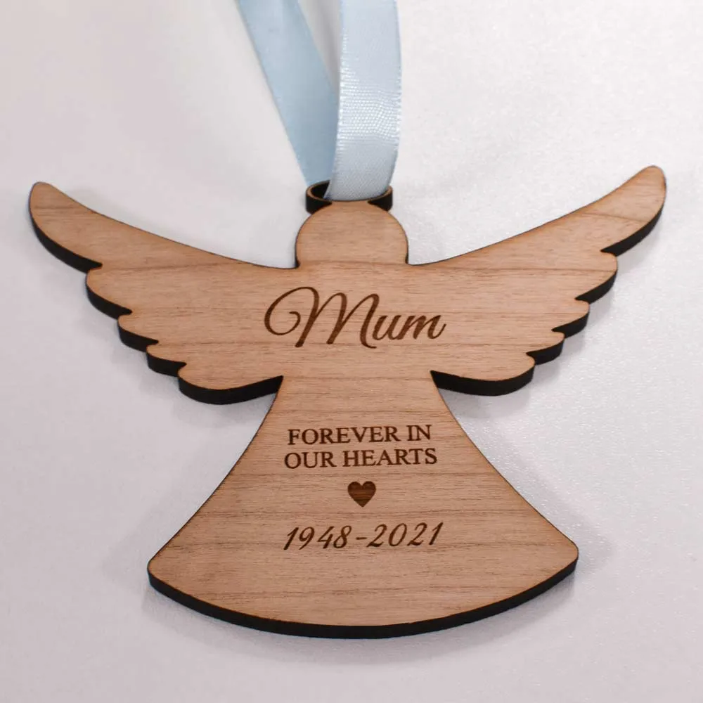 This bauble is made to order and is laser cut in an angel design with the text 'Forever in our hearts' engraved in the middle along with any name and date of your choice.