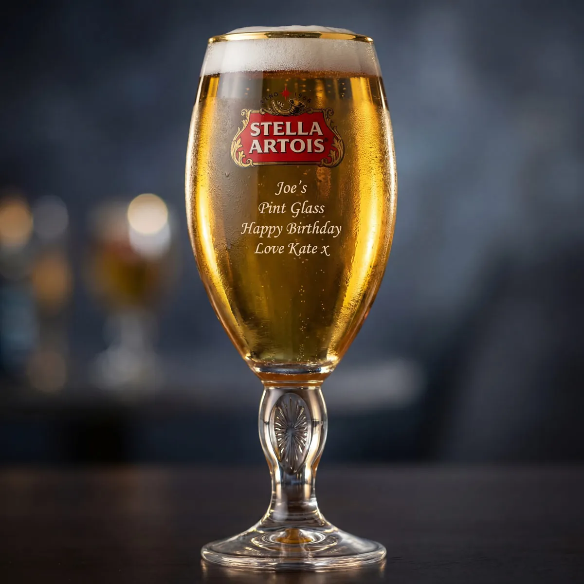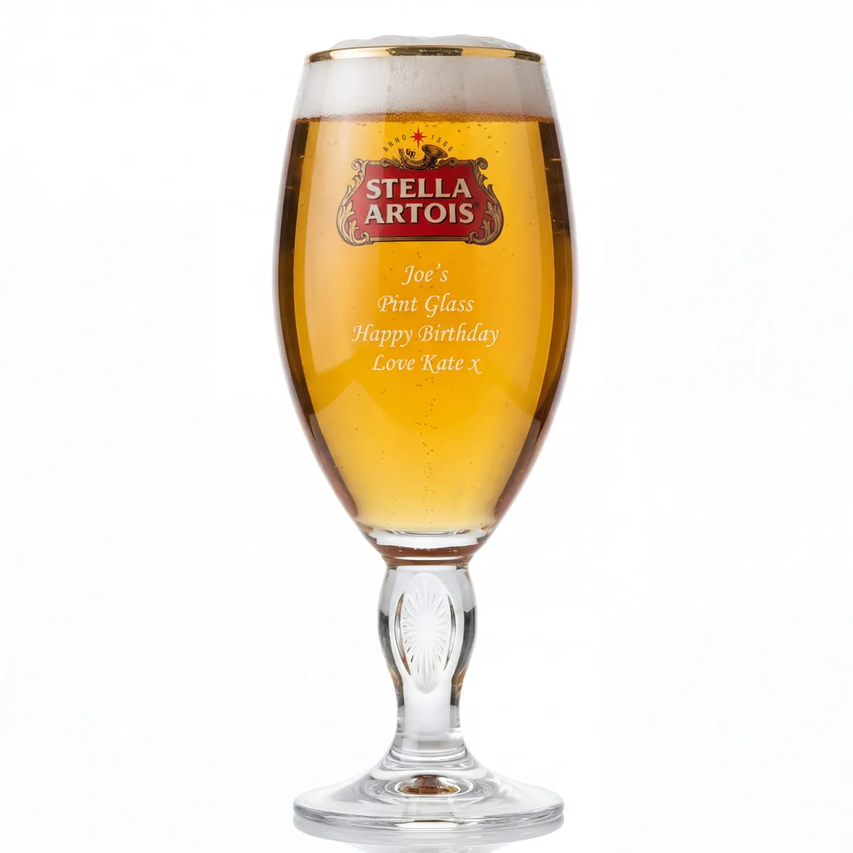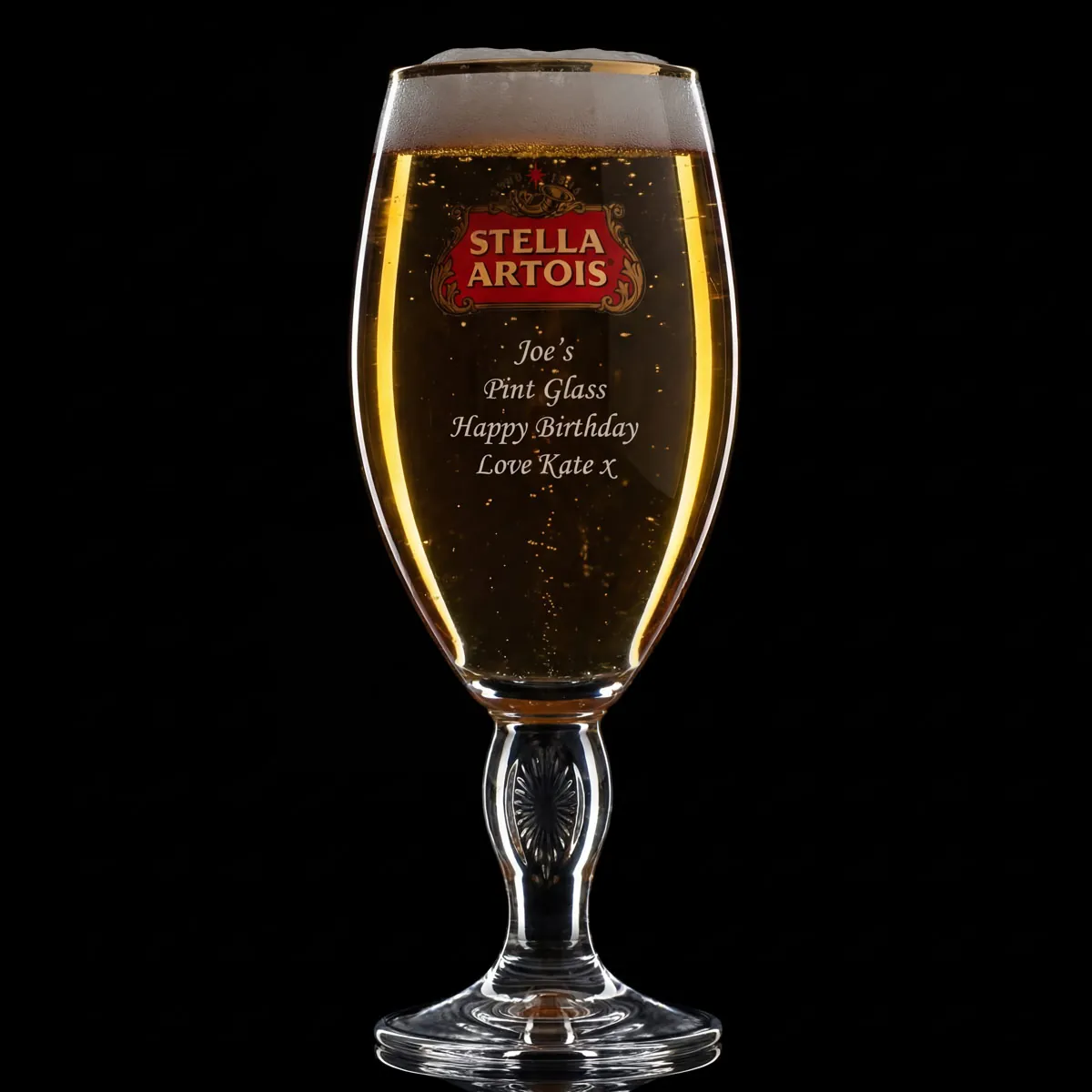 Official Stella Artois pint glass, professionally engraved with your personalised message.