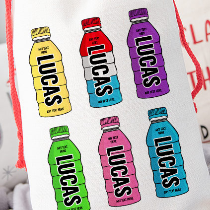 Store all of the kid's Christmas or Birthday gifts in this vibrant Hydration Drink Personalised Sack.