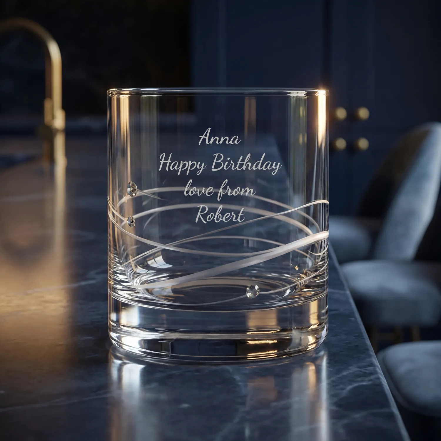 Our exclusive diamante whisky glass set is adorned with Swarovski crystal beads and is presented in a quality blue satin lined gift box.