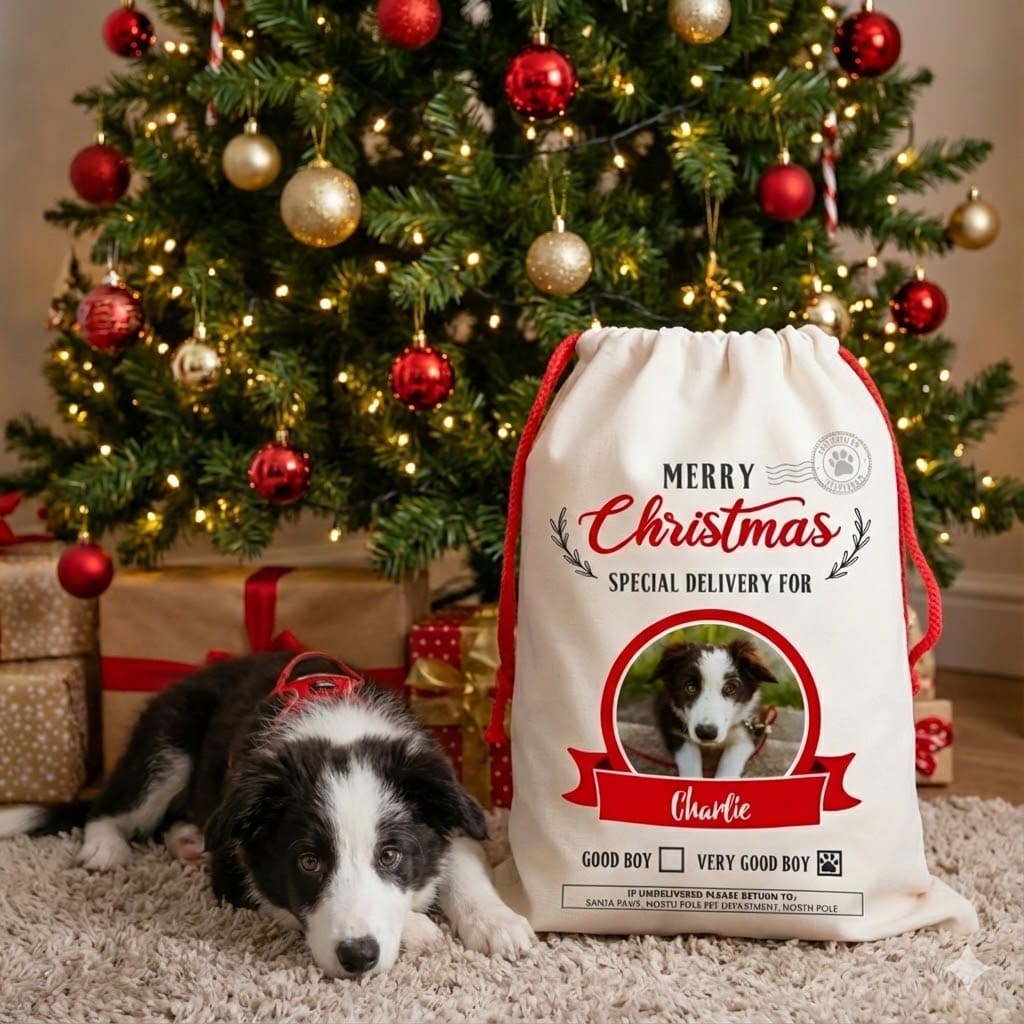 Dogs are a huge part of the family and should be treated that way when it comes to Christmas morning! You can have any photo of your choice printed on this beautiful Santa sack along with their name below.
