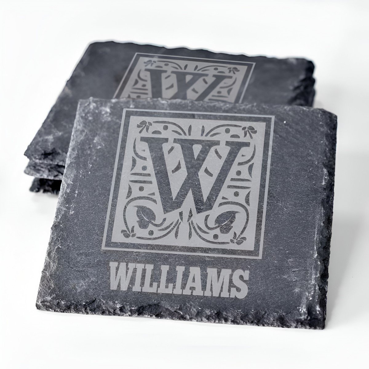 A set of four personalised monogram coasters engraved with any initial and a surname engraved.