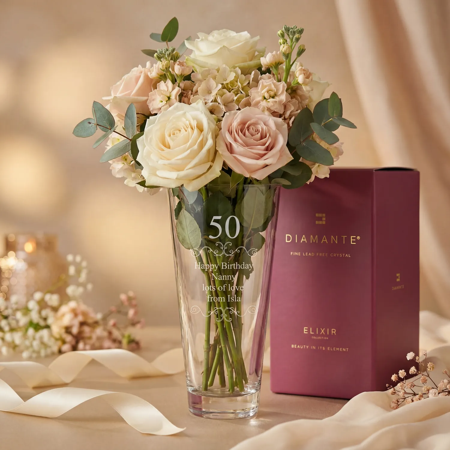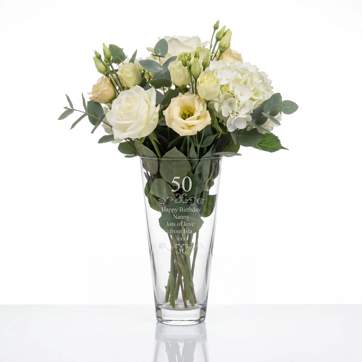 Celebrate a birthday or landmark wedding anniversary with this beautifully engraved personalised conical vase. This is a stunning gift for friends or loved ones and will look perfect with a bouquet.