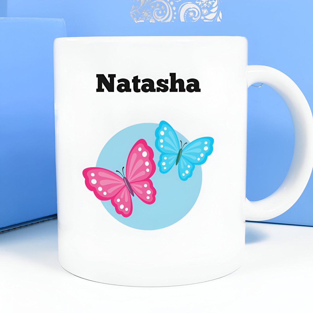 This personalised butterfly mug is a beautiful gift suitable for the home or office. Give it a personal touch by adding any name of your choice.
