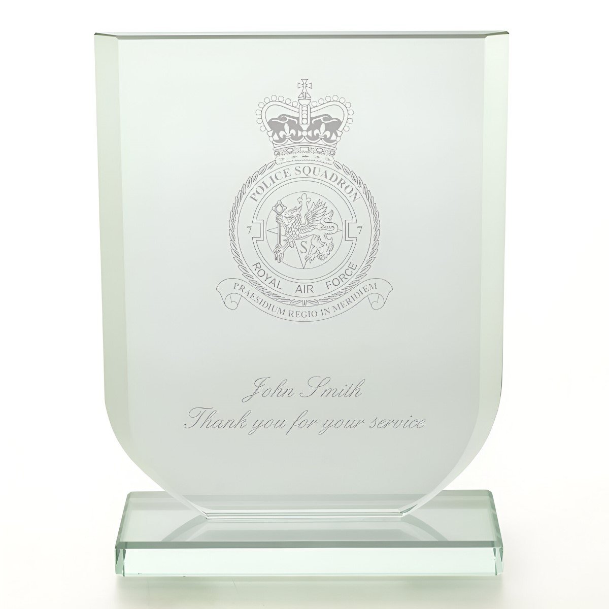 Have your logo professionally engraved onto this stunning glass shield trophy.