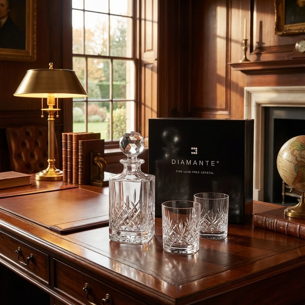 This elegant Buckingham Decanter Set includes a heavyweight fan cut crystal decanter and 2 luxurious personalised tumblers, beautifully presented in a branded satin-lined gift box.