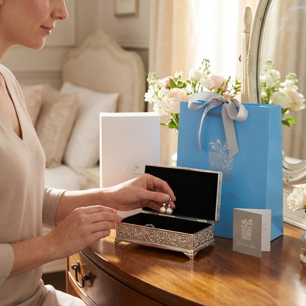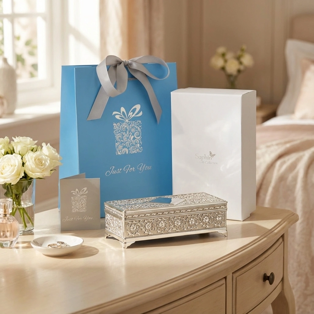 This jewellery box is presented in a quality gift box and white drawstring pouch. Why not engrave this with a special message to show how much you appreciate your mum. There is space on the silver-plated lid for an engraved message of around 50 characters.