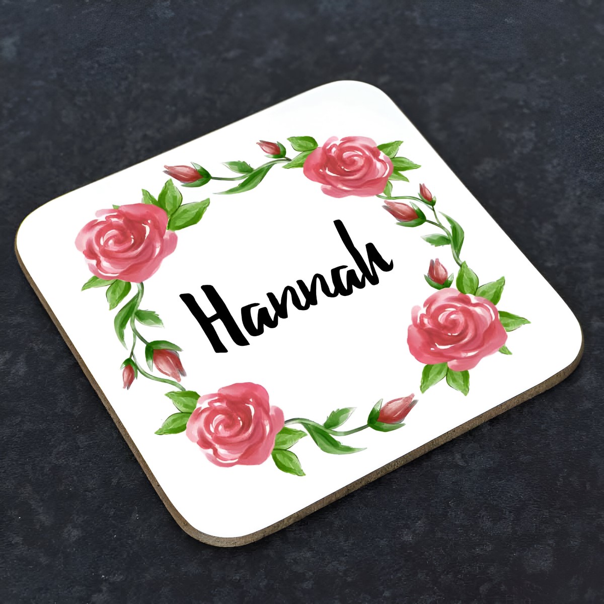 An attractive personalised coaster with beautiful hand-painted rose design. Add any name of your choice to create an elegant gift with an added personal touch.
