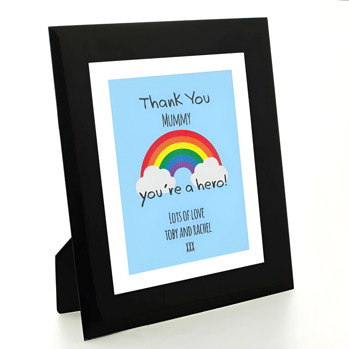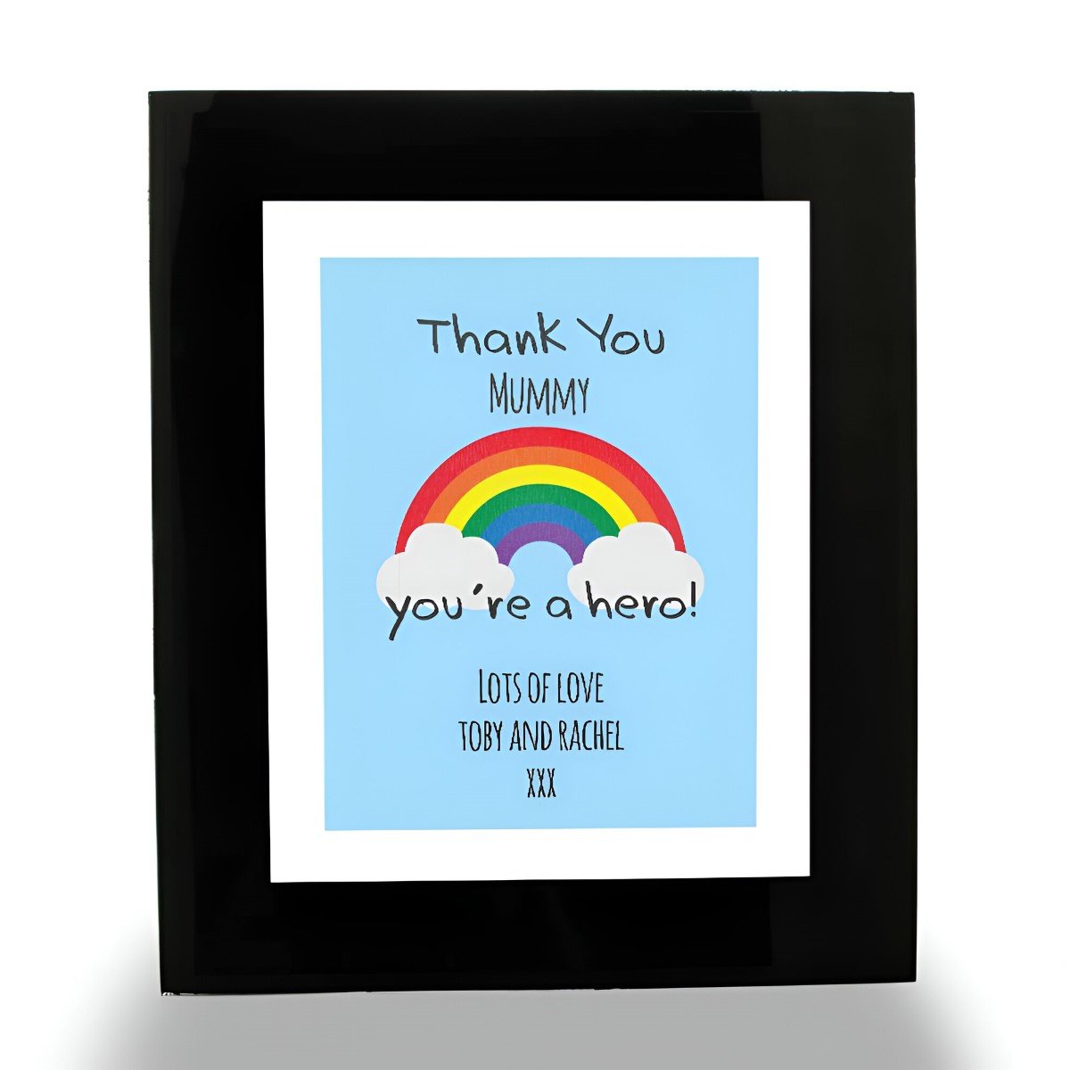 Thank someone amazing with this personalised thank you rainbow print. This print can be personalised with any name and message and will be mounted in a stunning black glass photo frame. This is a wonderful gesture for a keyworker or someone who has always gone the extra mile.