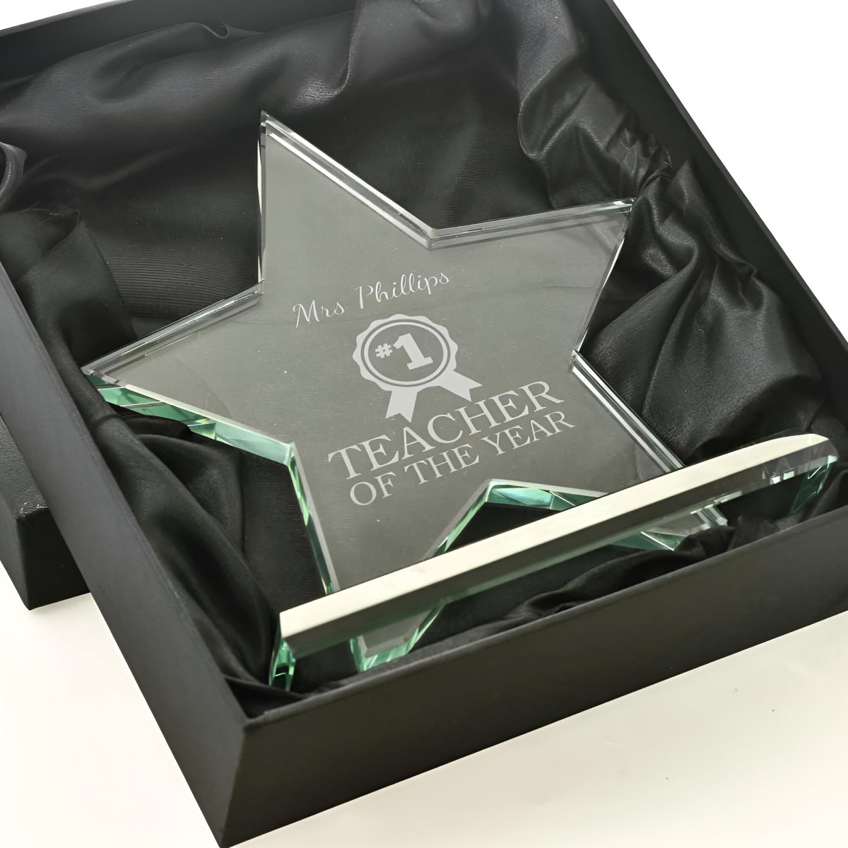 Thank your teacher for being the Teacher Of The Year with this stunning glass star trophy.