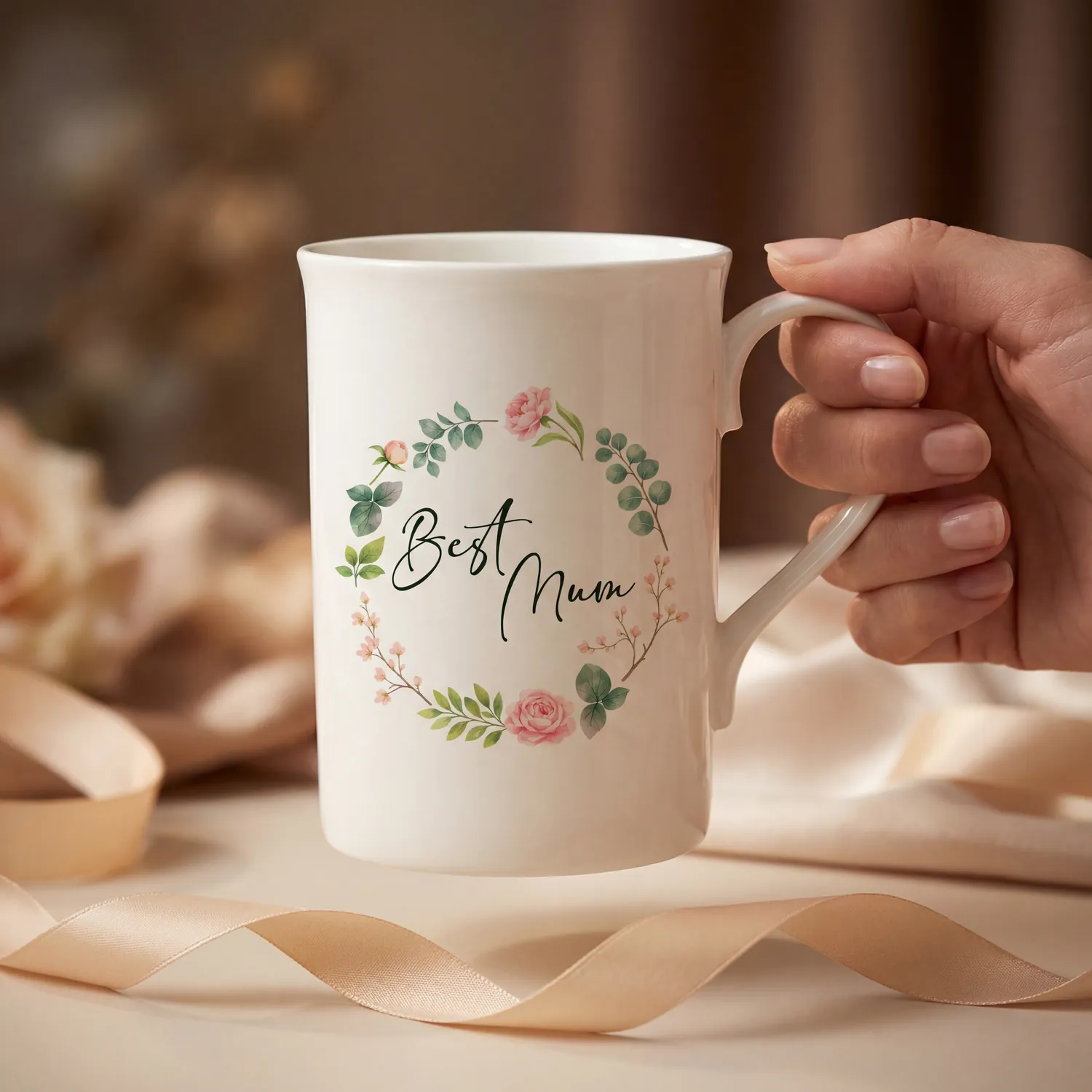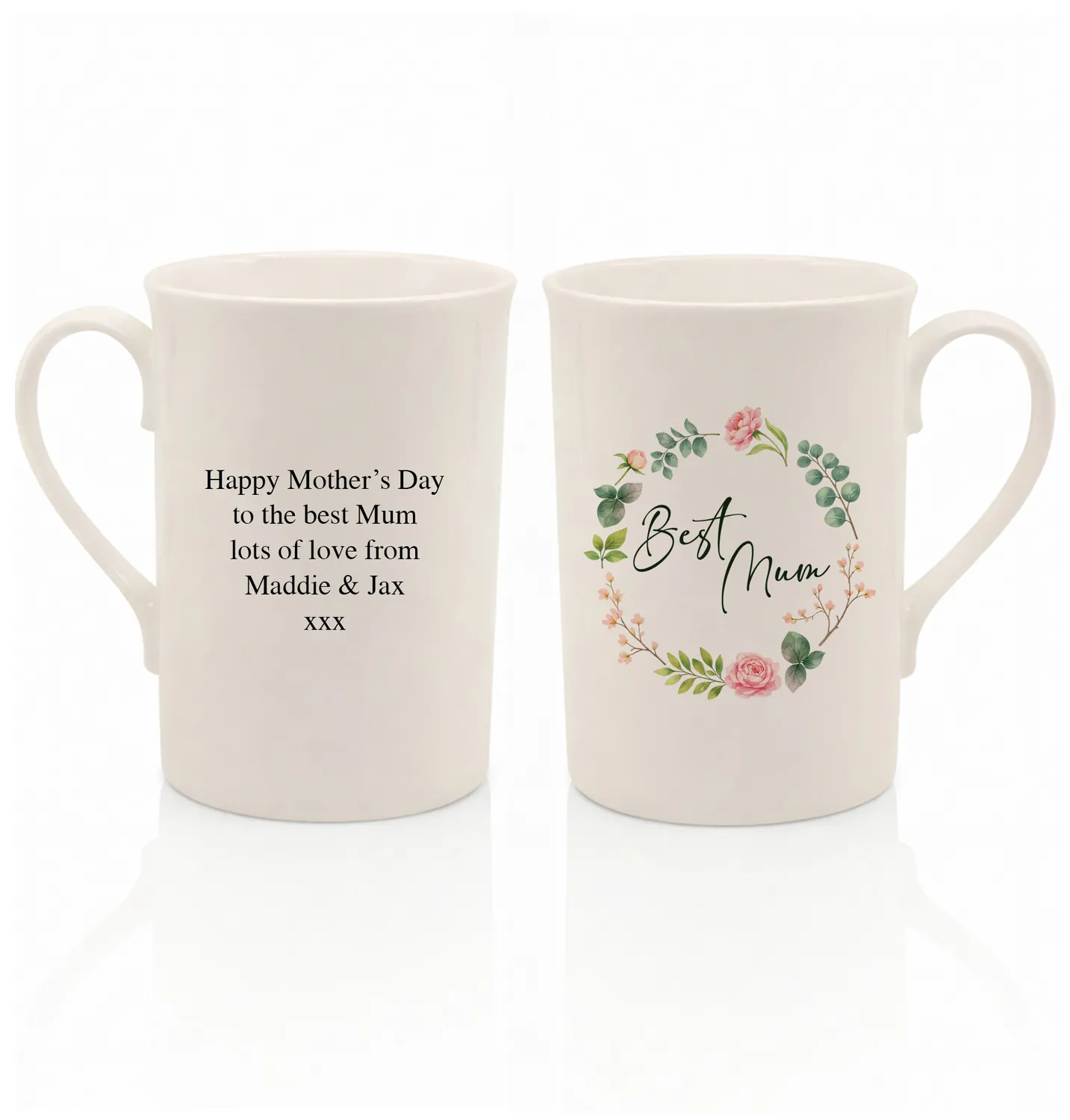 Show Mum just how much she means to you with this beautifully personalised bone china mug. Featuring an elegant botanical wreath with soft pink florals and delicate greenery, the “Best Mum” design is timeless, heartfelt, and perfect for any occasion.