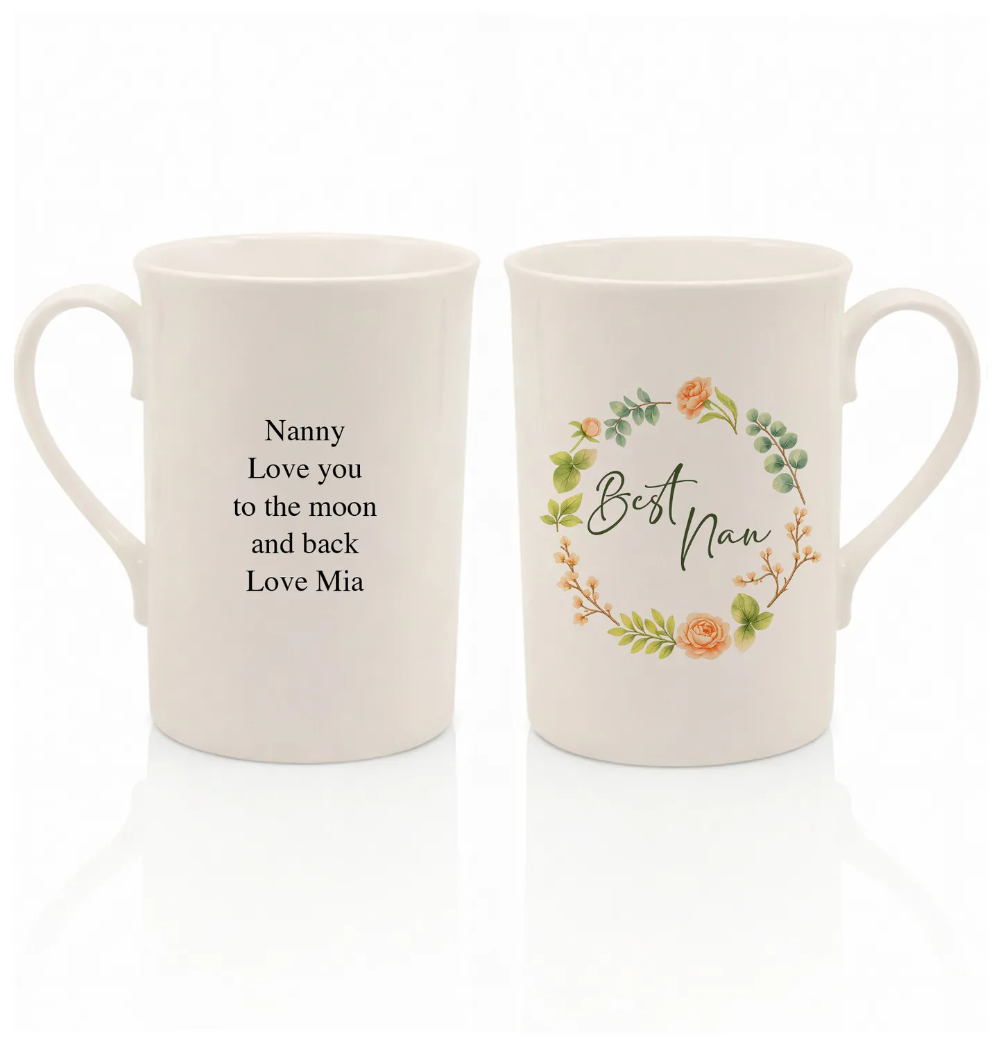 Celebrate a wonderful Nan with a gift that’s both beautiful and meaningful. This personalised bone china mug features a delicate floral wreath in soft peach and green tones, framing the elegant “Best Nan” script on the front.