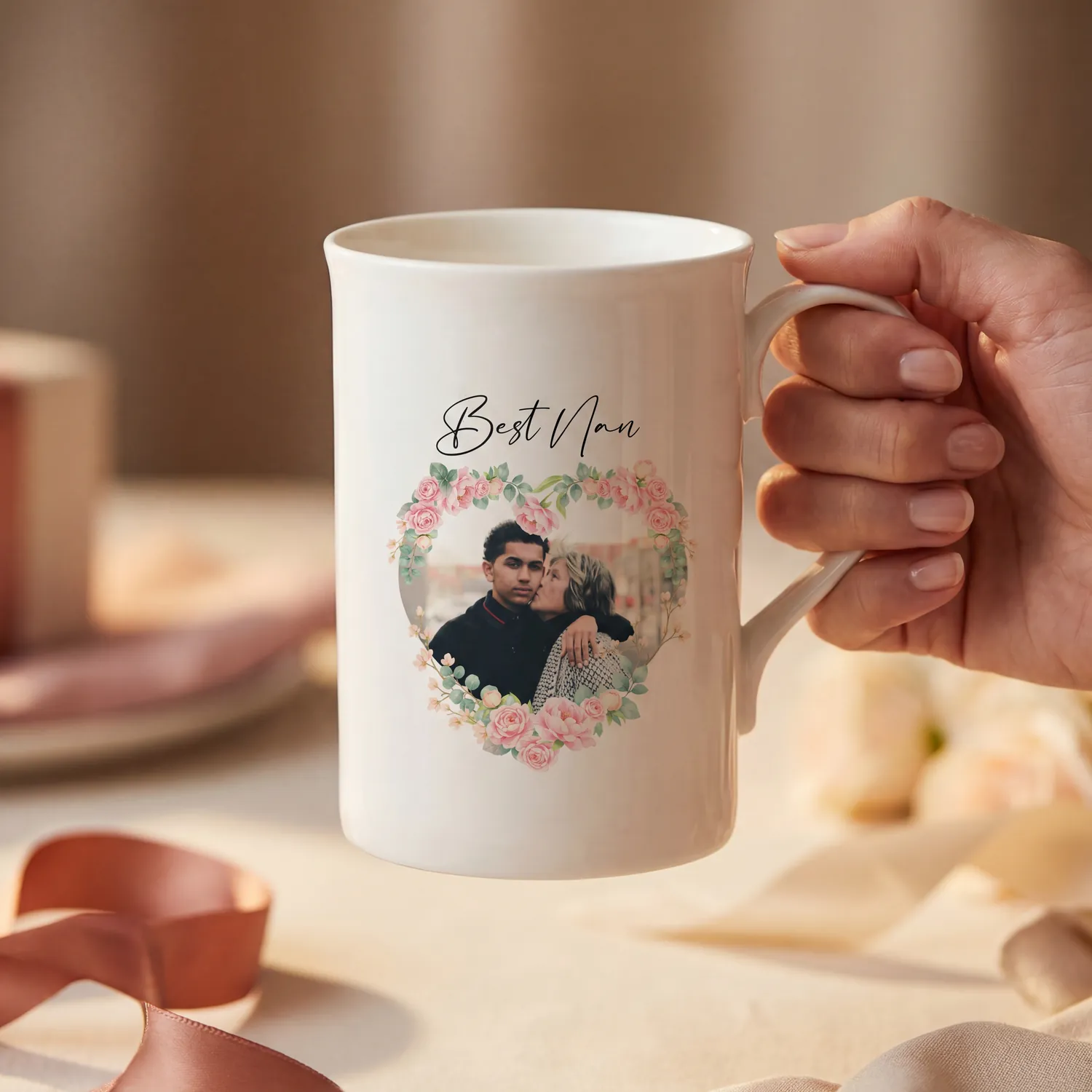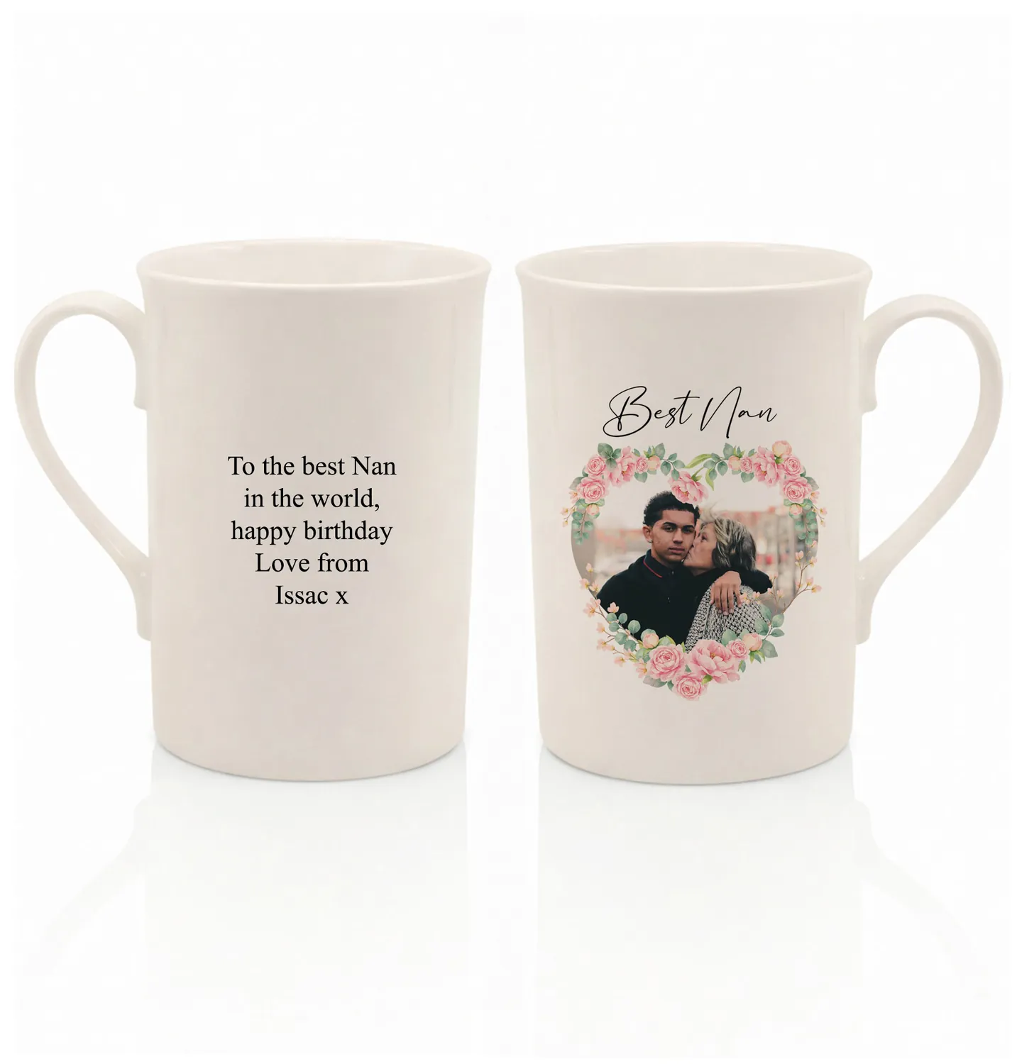 Featuring an elegant floral heart frame design and your personalised wording on the reverse, this mug blends timeless style with sentimental value. Whether it’s a cherished family photo, a picture of the grandchildren, or a moment you both love, it transforms an everyday essential into something unforgettable.