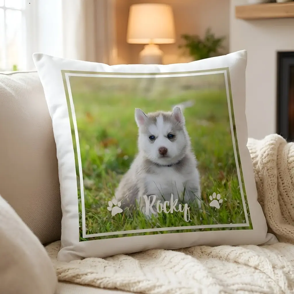 - You can personalise this dog photo pillow with any photo of your choice. Upload your most beloved photo of your canine friend to be printed within a stylish white border.
